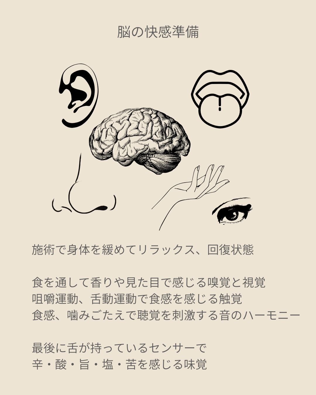 緩めて自然体な状態になったところに、食べるという咀嚼運動と舌動運動を始め、視覚、嗅覚、嗅覚、触覚、味覚をフルに可動させて、五感を感じていただきます。